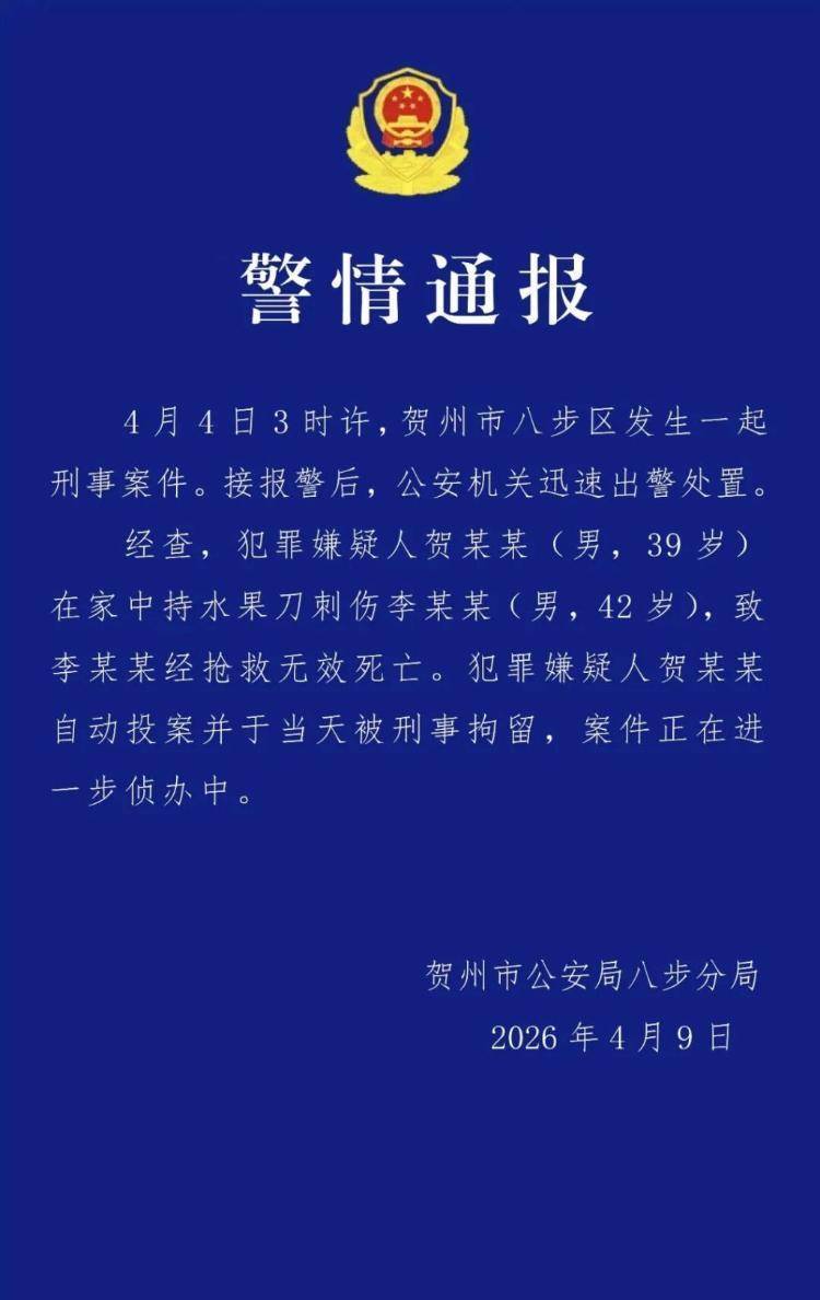 南京网上配资 广西贺州警方:男子凌晨在家中刺死另一男子后自首,已被刑拘